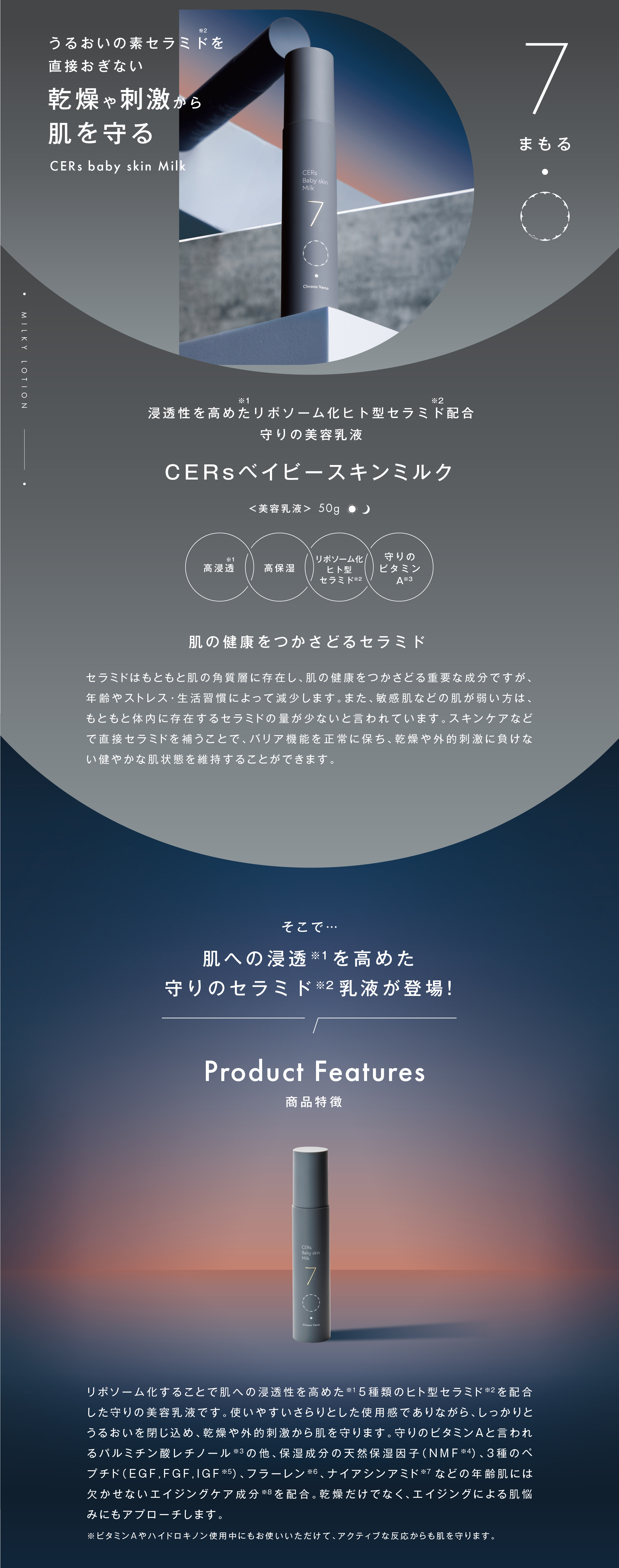 | 特徴 | リポソーム化することで肌への浸透性を高めた※1 5種類のヒト型セラミド※2を配合した守りの美容乳液です。 守りのビタミンAと言われるパルミチン酸レチノール※3 の他、保湿成分の天然保湿因子(NMF ※4)、3種のペプチド(EGF,FGF,IGF)※5~7、フラーレン※8、ナイアシンアミド※9 などの年齢肌には欠かせないエイジングケア成分※10を配合。使いやすいさらりとした使用感でありながら、しっかりとうるおいを閉じ込め、乾燥や外的刺激から肌を守ります。 ※1:角質層まで ※2:セラミドNG、セラミドAP、セラミドAG、セラミドNP、セラミドEOP(整肌成分) ※3:パルミチン酸レチノール(整肌成分) ※4:PCA-Na、乳酸Na、アルギニン、アスパラギン酸、PCA、グリシン、アラニン、セリン、バリン、イソロイシン、トレオニン、フィトステロールズ、プロリン、ヒスチジン、フェニルアラニン(整肌成分) ※5:ヒト遺伝子組換オリゴペプチド-1(整肌成分) ※6:ヒト遺伝子組換ポリペプチド-11(整肌成分) ※7オリゴペプチド-20(整肌成分) ※8フラーレン(整肌成分) ※9:ナイアシンアミド(整肌成分) ※10:年齢に応じたケア |