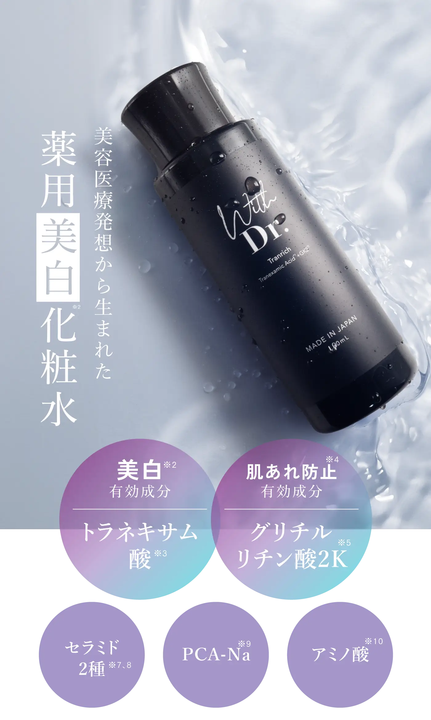 | 特徴 | 美容医療発想で開発された薬用美白(※1)化粧水。 美白(※1)有効成分【トラネキサム酸(※2)】と、肌あれ防止(※3)有効成分【グリチルリチン酸2K(※4)】を配合。さらに肌バリア機能を支える保湿成分も配合。 "攻めと守り"を両立した処方で肌をすこやかに保ち、明るい印象に導きます。 レチチール(ビタミンA)を含むアイテムとライン使いしやすいよう配慮された処方設計で、毎日のスキンケアに取り入れやすいアイテムです。 ※1 メラニンの生成を抑えてしみ・そばかすを防ぐ ※2 トラネキサム酸(美白有効成分) ※3 乾燥や外部刺激による肌あれ ※4 グリチルリチン酸2K(肌あれ有効成分) |